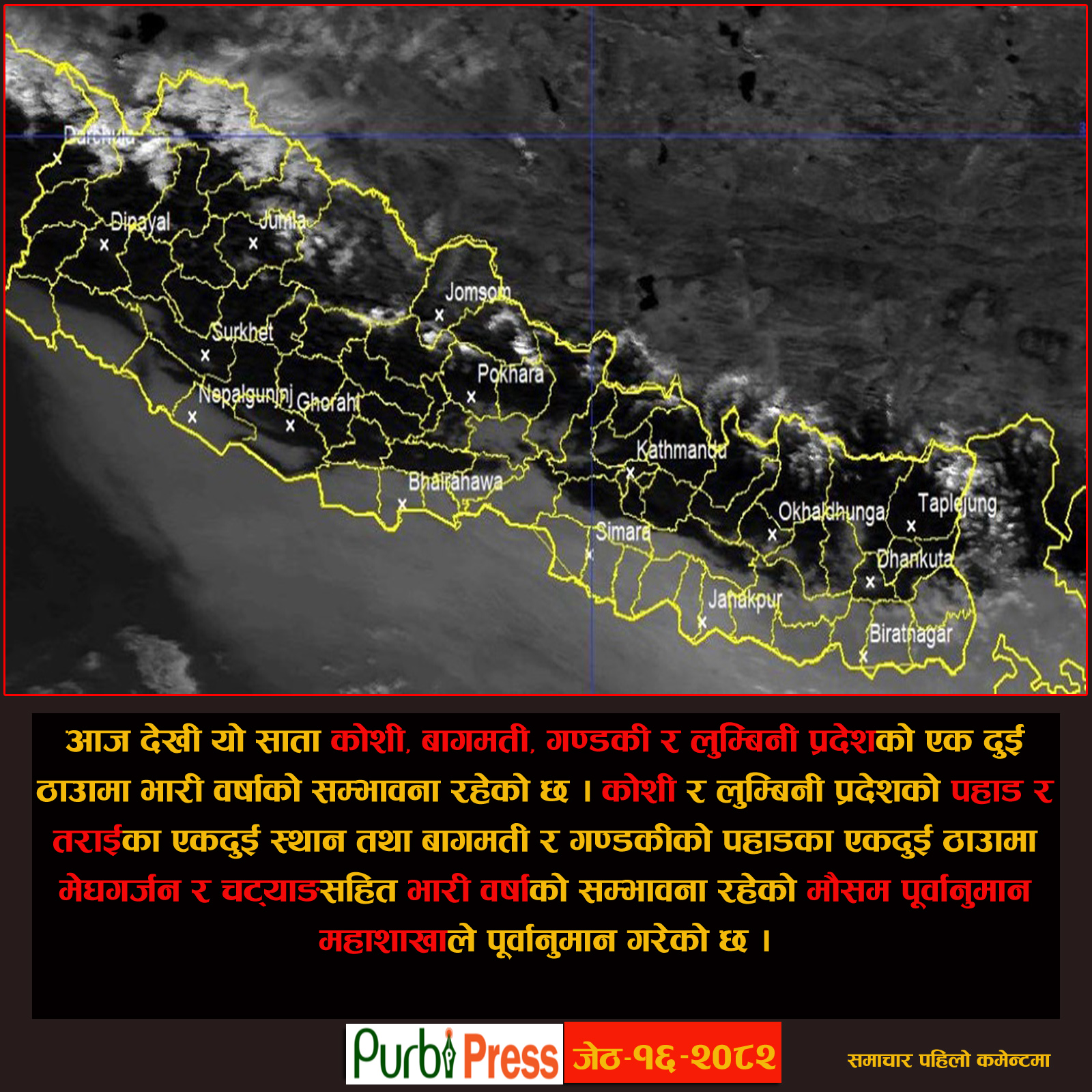 काठमाडौं, २१ साउन । नेपालमा मंगलबार (भोलि) र बुधबार (पर्सि) अति भारी वर्षा हुने सम्भावना रहेको बताइएको छ । २ दिन पानी पार्ने मनसुन प्रणाली […]