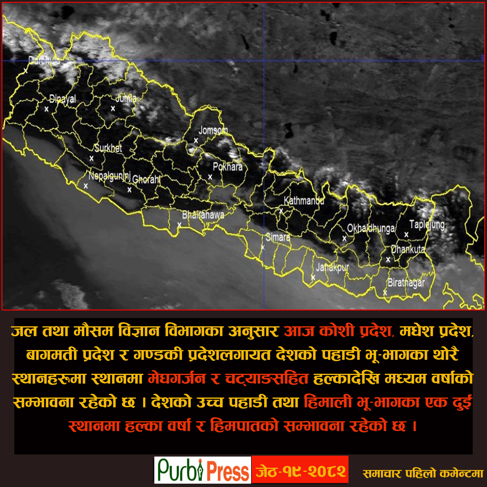 काठमाडौँ । जल तथा मौसम विज्ञान विभाग, मौसम पूर्वानुमान महाशाखाका अनुसार आज देशभर आंशिकदेखि साधारणतया बदली रही कोशी प्रदेश र मधेश प्रदेशका थोरै स्थानहरूमा मेघगर्जन […]